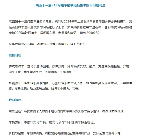 我的遭遇绝非个例。陕西第十一届315问题车展数据显示,2024年领克车主投诉量激增,领克08 EM-P成重灾区: